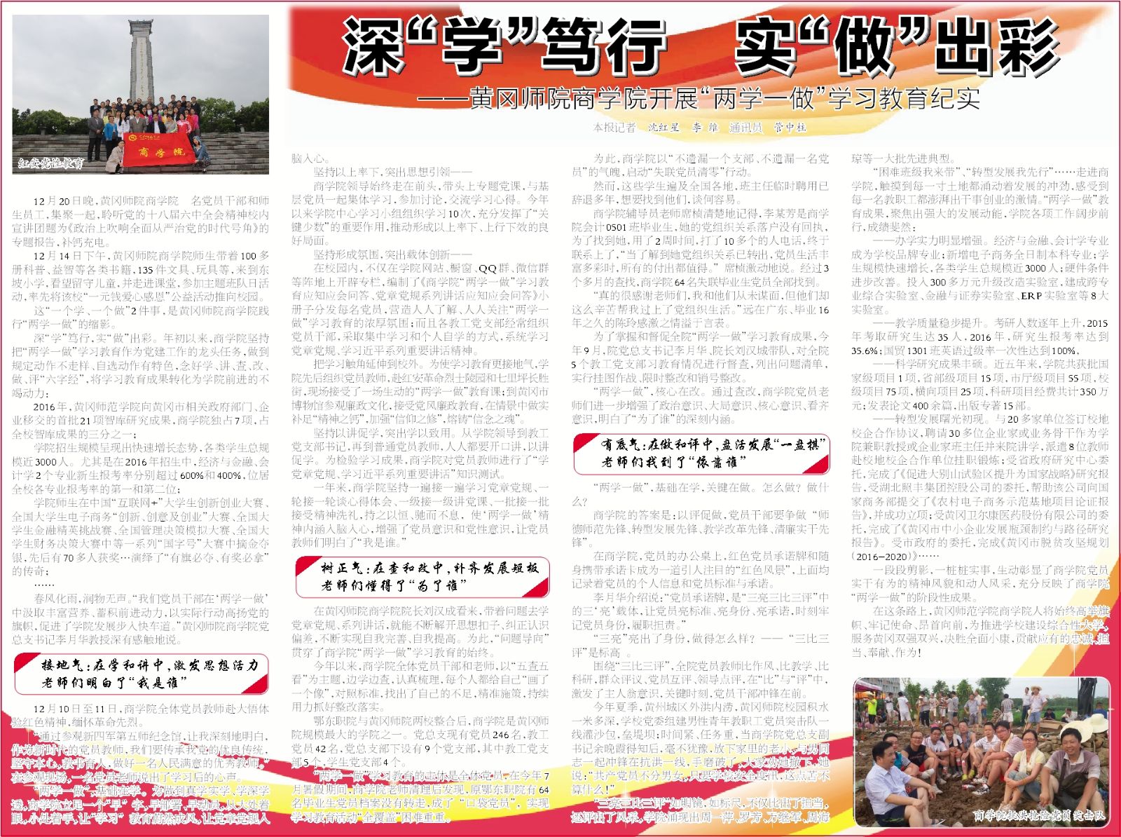 本网讯(通讯员 管中柱)12月29日,《黄冈日报》专版报道了我校商学院2016年开展“两学一做”学习教育纪实。报道图文并茂,从“接地气:在学和讲中,激发思想活力,老师们明白了‘我是谁’”、“树正气:在查和改中,补齐发展短板,老师们懂得了‘为了谁’”、“有底气:在做和评中,盘活发展“一盘棋”,老师们找到了‘依靠谁’”三个层面全面报道了商学院党员实干有为的精神风貌和动人风采,充分反映了商学院“两学一做”的阶段性成果,展示了商学院将始终高举旗帜、牢记使命、昂首向前,为推进学校建设特色鲜明的高水平综合性应用型大学,服务黄冈“双强双兴”,决胜全面小康,贡献应有的忠诚、担当、奉献、作为!